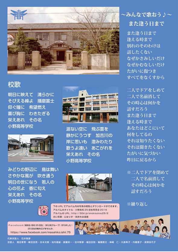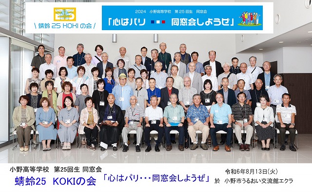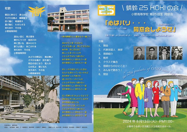 最後には、皆で声を上げて高校時代に流行った「あの素晴らしい愛をもう一度」そして母校の「校歌」を大きな声で唄いましたね。会えなかった8年の間にも、何人かの同級生が亡くなりました。また、開催を心待ちにされていた恩師、糟谷宏先生が4月5日に永眠されたのは誠に残念でした。次回開催は、ロス五輪の年、蜻蛉の故郷・小野でお会いしましょう。元気なお顔をお見せ下さい。(世話役M)