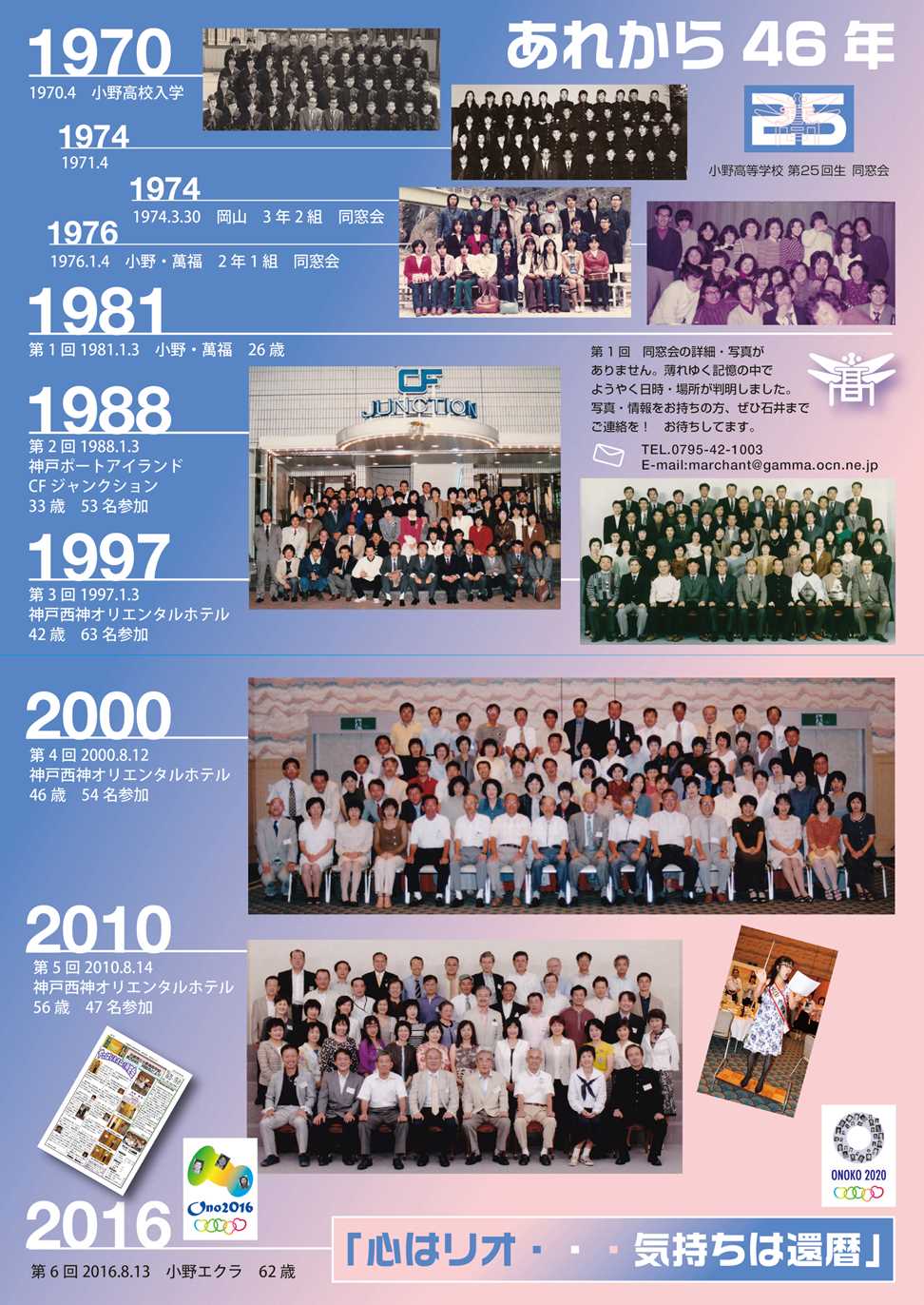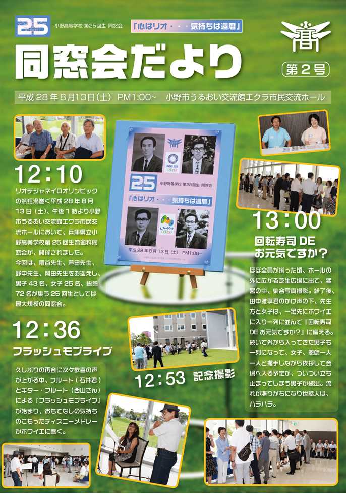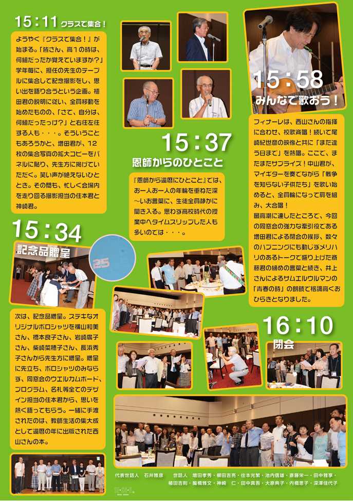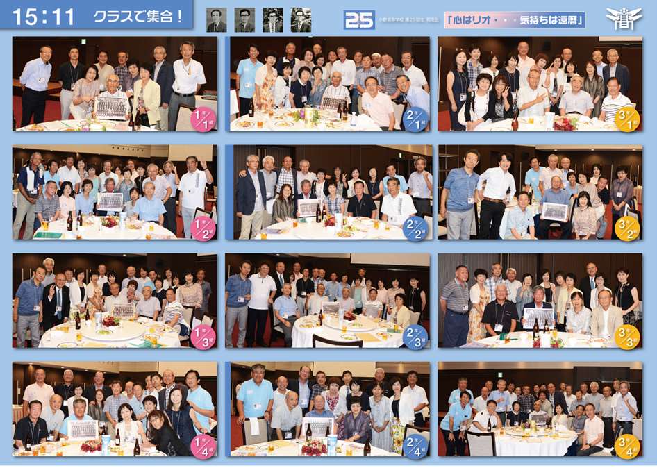 世話人14名が、オンラインとオフラインのミーティングを重ねて練り上げた楽しい企画に会場は、大盛り上がり。バレー部のコントでは、突然本物の糟谷生が飛び入り出演!82歳とは思えないキレのあるプレーに拍手喝采。 「恩師から還暦を迎えた25回生にひとこと」では、お一人お一人の年輪を重ねた深いお言葉に、全員静かに聞き入りました。 フィナーレは、声を張り上げ「校歌斉唱」、「また逢う日まで」を熱唱。続いて参加者の一人が、サプライズでマイギターを奏でながら当時流行った「戦争を知らない子供たち」を歌い始めると全員肩を組み、輪になって大合唱。 久々の歓喜の再会に始まり、二次会に至るまで、リオに負けない熱気と笑顔あふれる会となり、お互い25回生の絆を確かめ合うことができました。 この同窓会のために惜しみなく力を貸して下さった方々に心より感謝申し上げます。 静岡からはるばるギター、フルート、三線を持参し演奏してくれた仲間、高校時代の顔写真入り名札、ウエルカムボード、プログラム、テーブルカード、ポロシャツ、同窓会だより等のデザインを担当してくれた仲間・・・数え上げたらきりがありません。 東京オリンピック開催年の再会を楽しみに、先生方のお言葉のように、還暦を人生の一つの通過点ととらえ、今後も健康に留意し、友人を大切に、前向きに生きていきたいものです。